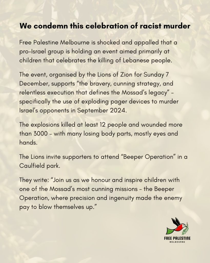 Free Palestine Melbourne is shocked and appalled that a pro-Israel group is holding an event aimed primarily at children that celebrates the killing of Lebanese people.