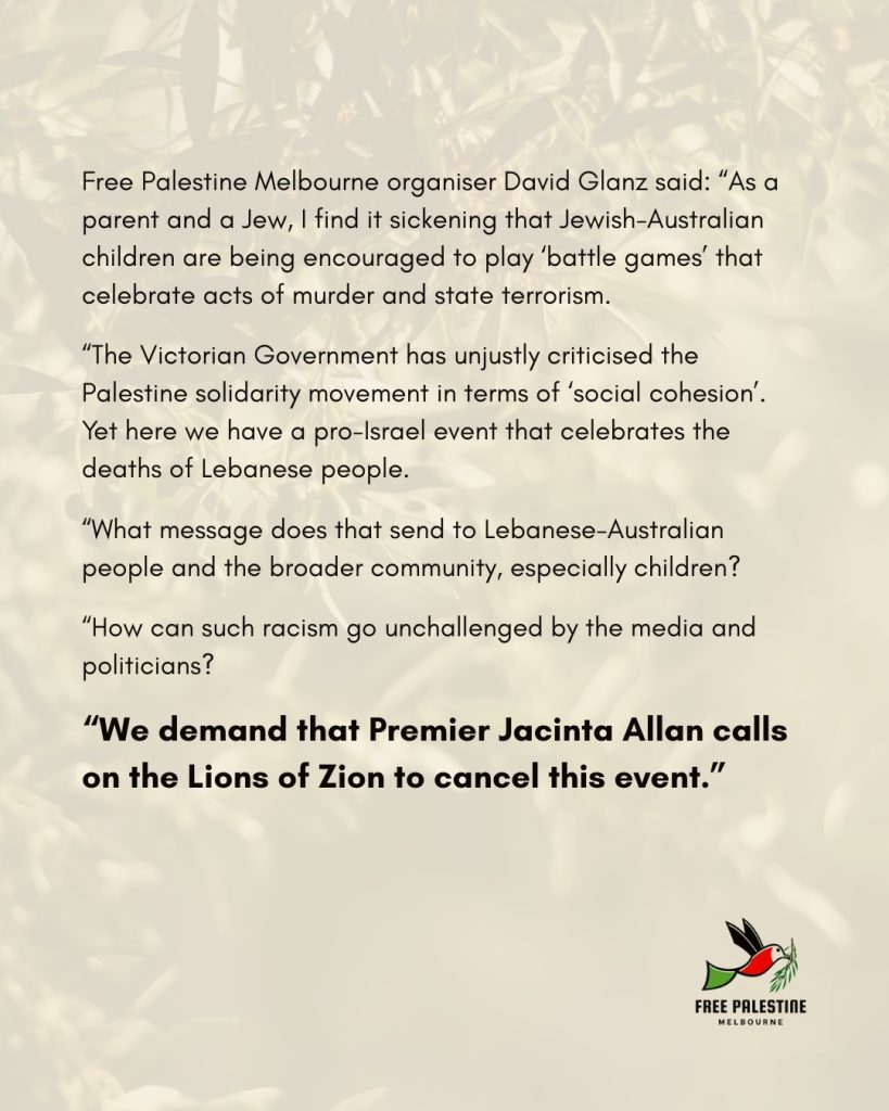 Free Palestine Melbourne organiser David Glanz said: “As a parent and a Jew, I find it sickening that Jewish-Australian children are being encouraged to play ‘battle games’ that celebrate acts of murder and state terrorism.